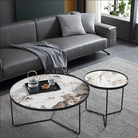 Muebles al por mayor estilo de lujo italiano Villa mesa de centro redonda conjunto de mármol/porcelana losa mesa superior sala de estar mesa de centro